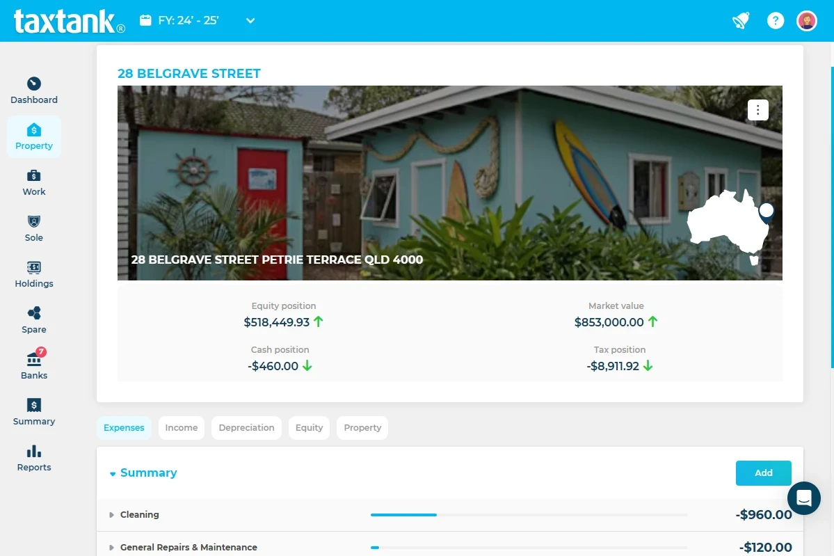 The Property Accountant lets you track property income and expenses and generate reports. TaxTank includes CoreLogic-powered property values, live equity and LVR calculations, yields, borrowing power reports, and capital growth tracking which gives you a full investment performance picture, not just the numbers you need for tax time.