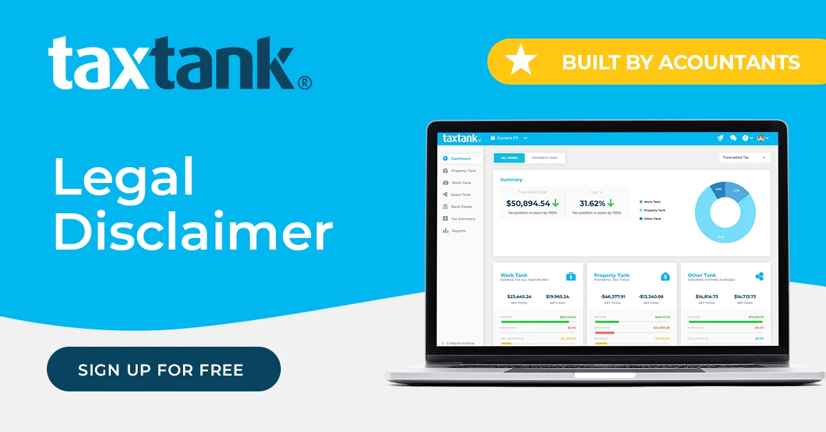 All Business Administration Pty Ltd (ABN 64 124 056 828) trading as “TaxTank Accountants” is a proud TaxTank partner offering a select range of tax and accounting services exclusively to TaxTank subscribers. TaxTank Accountants operates as an autonomous Tax Agency, distinct from TaxTank. It is important to emphasise that subscribers of TaxTank are under no obligation to engage the services of TaxTank Accountants. The provision of tax and accounting services by TaxTank Accountants is an independent offering, and the decision to utilise their services rests solely with the individual TaxTank subscriber.