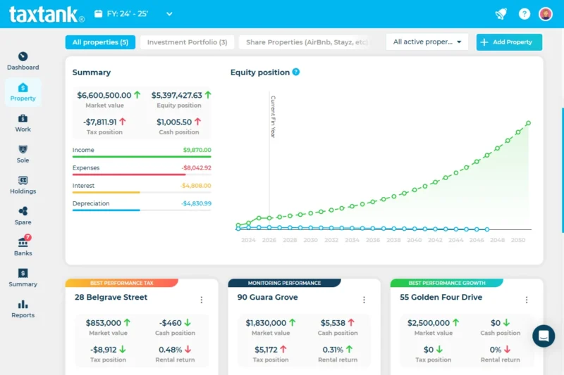 TaxTank takes the headache out of managing investment properties. Track income and expenses in real time, monitor capital growth, automate depreciation, and see the impact on your tax position instantly. Whether you own one property or ten, in your own name or a trust, everything’s in one place